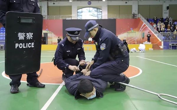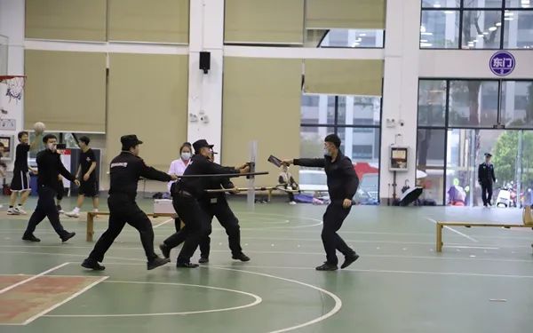 随后在学院体艺馆开展的反恐实地演练中,模拟了两名“暴徒”混入校园袭击在校学生,校园安保人员发挥扎实的处置能力,第一时间报警求助并有序地组织现场人员安全撤离,随后与迅速到场的民警们合力将“暴徒”制服,成功解除危机的场景。此次演练安全有序,达到了预期效果,强化了对师生的反恐宣传教育。演练最后,反恐大队民警还为学院安保人员进行了反恐防暴器具使用培训。