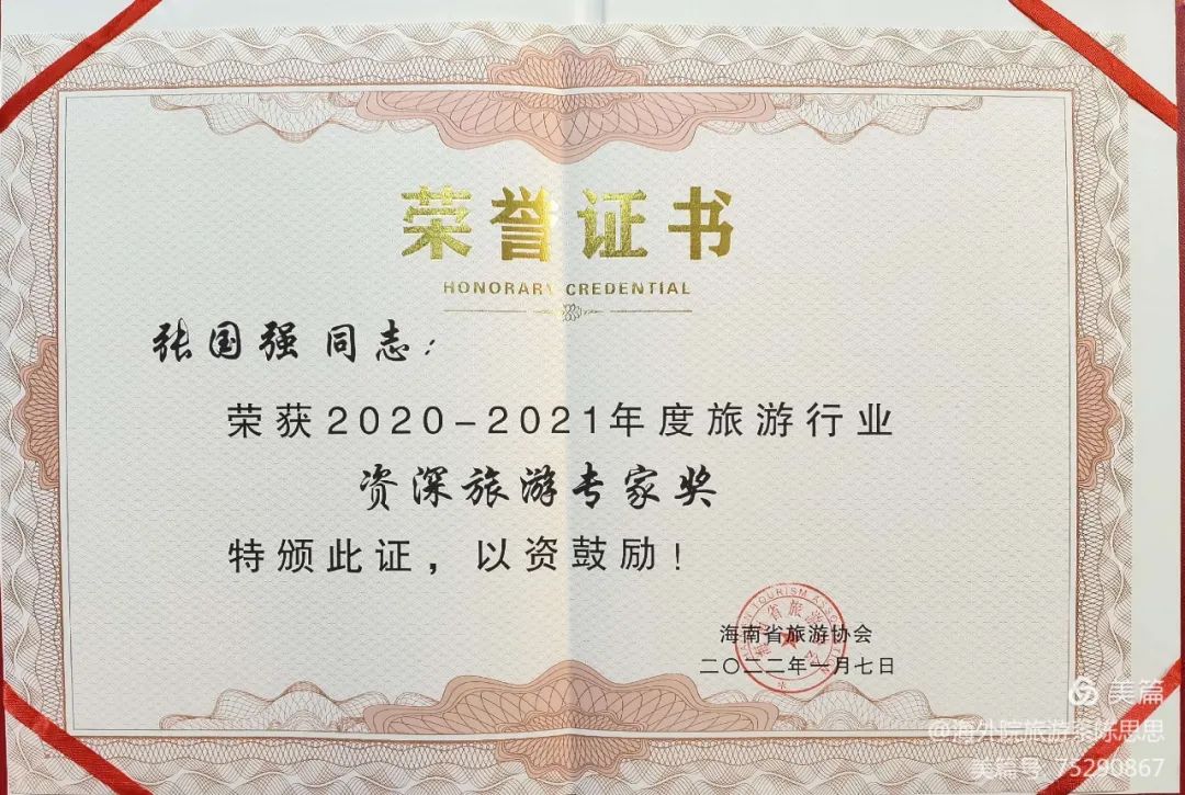 beat365英国官方网站旅游系张国强老师荣获资深旅游专家奖。