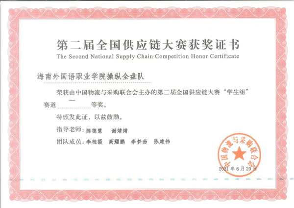 第二届全国供应链大赛总决赛全国一等奖奖状