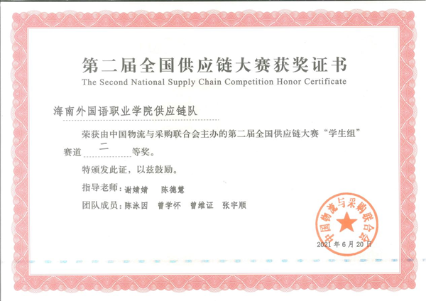 第二届全国供应链大赛总决赛全国二等奖奖状