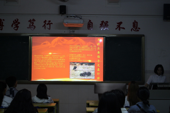 首先,由东语系社会实践部吴紫棋同学以PPT和视频的形式向参加此次会议的同学普及“粮食危机”和“舌尖上的浪费”的相关内容。让同学们认识到了浪费粮食是可耻的,也培养了同学节约粮食,爱惜粮食的意识,做到杜绝“舌尖上的浪费”。
