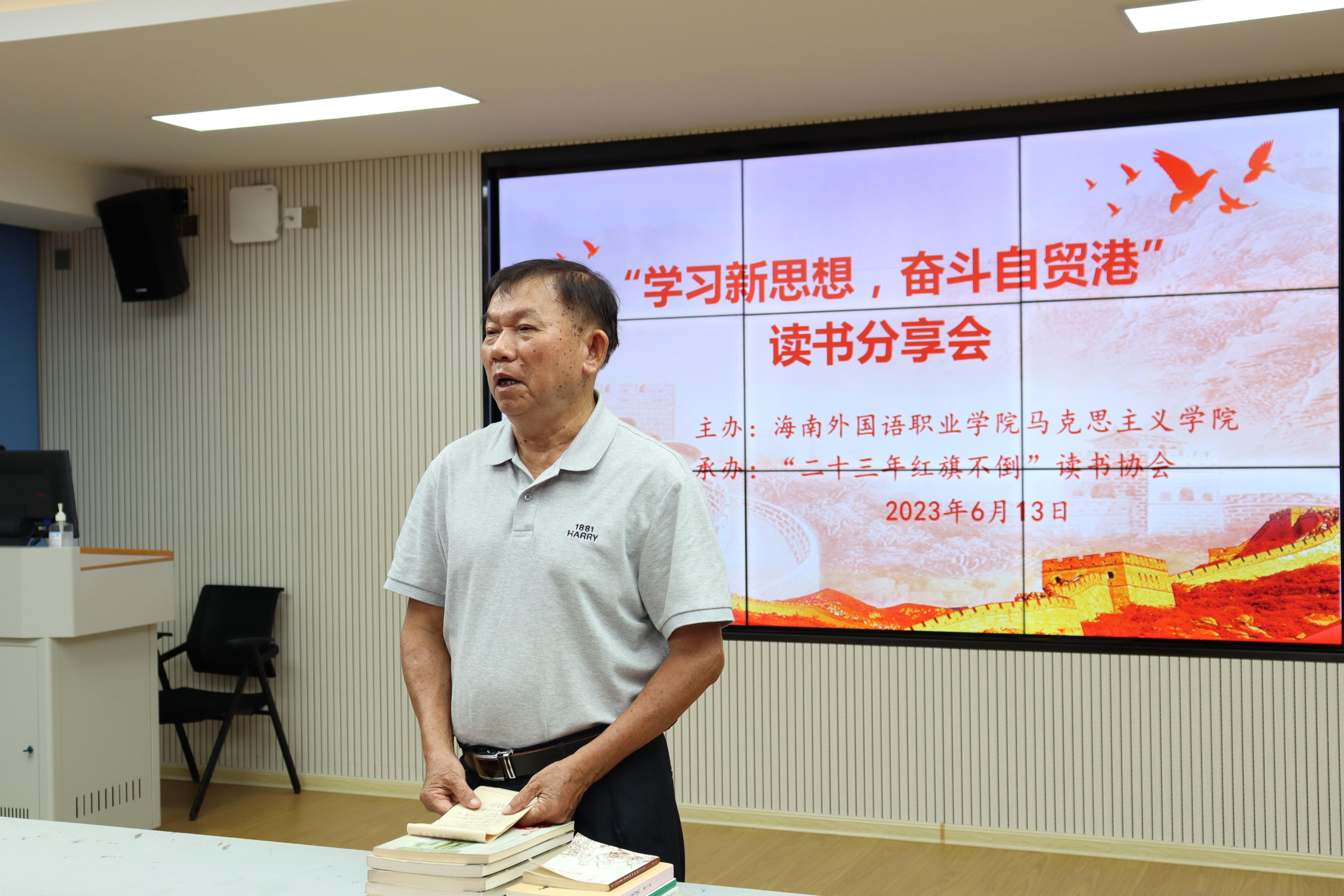 为学习贯彻习近平新时代中国特色社会主义思想主题教育和深入学习马克思主义思想,提高思想政治素养,培养青年大学生成为中国特色社会主义事业的践行者和奋斗者,6月13日,beat365英国官方网站“二十三年红旗不倒”协会在多媒体教室7开展“学习新思想,奋斗自贸港”读书分享会。协会指导老师赵佳钰主持本场活动,关心下一代工作委员会韩祝畴主任、团委韩琪老师及团委学生干部参加本场分享会。