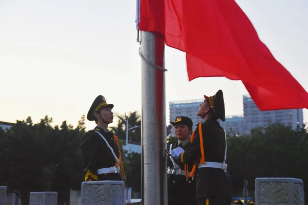 六点五十分,升旗仪式正式开始。学院国旗护卫队成员踏着铿锵有力的步伐来到升旗台下,当庄严的国歌响起,升旗手振臂一挥,鲜艳的五星红旗冉冉升起。