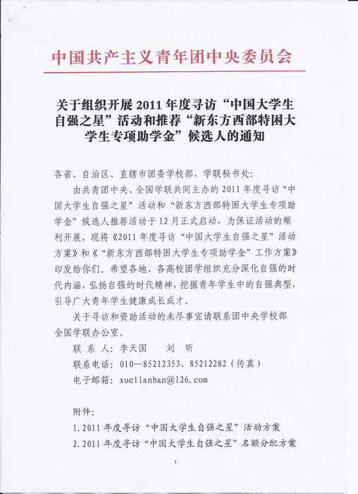 由共青团中央、全国学联共同主办的2011年度寻访“中国大学生自强之星”活动和“新东方西部特困大学生专项助学金”候选人推荐活动于12月正式启动,为保证活动的顺利开展,现将《2011年度寻访“中国大学生自强之星”活动方案》和《“新东方西部特困大学生专项助学金”工作方案》印发给你们。希望各地、各高校团学组织充分深化自强的时代内涵,弘扬自强的时代精神,挖掘青年学生中的自强典型,引导广大青年学生健康成长成才。