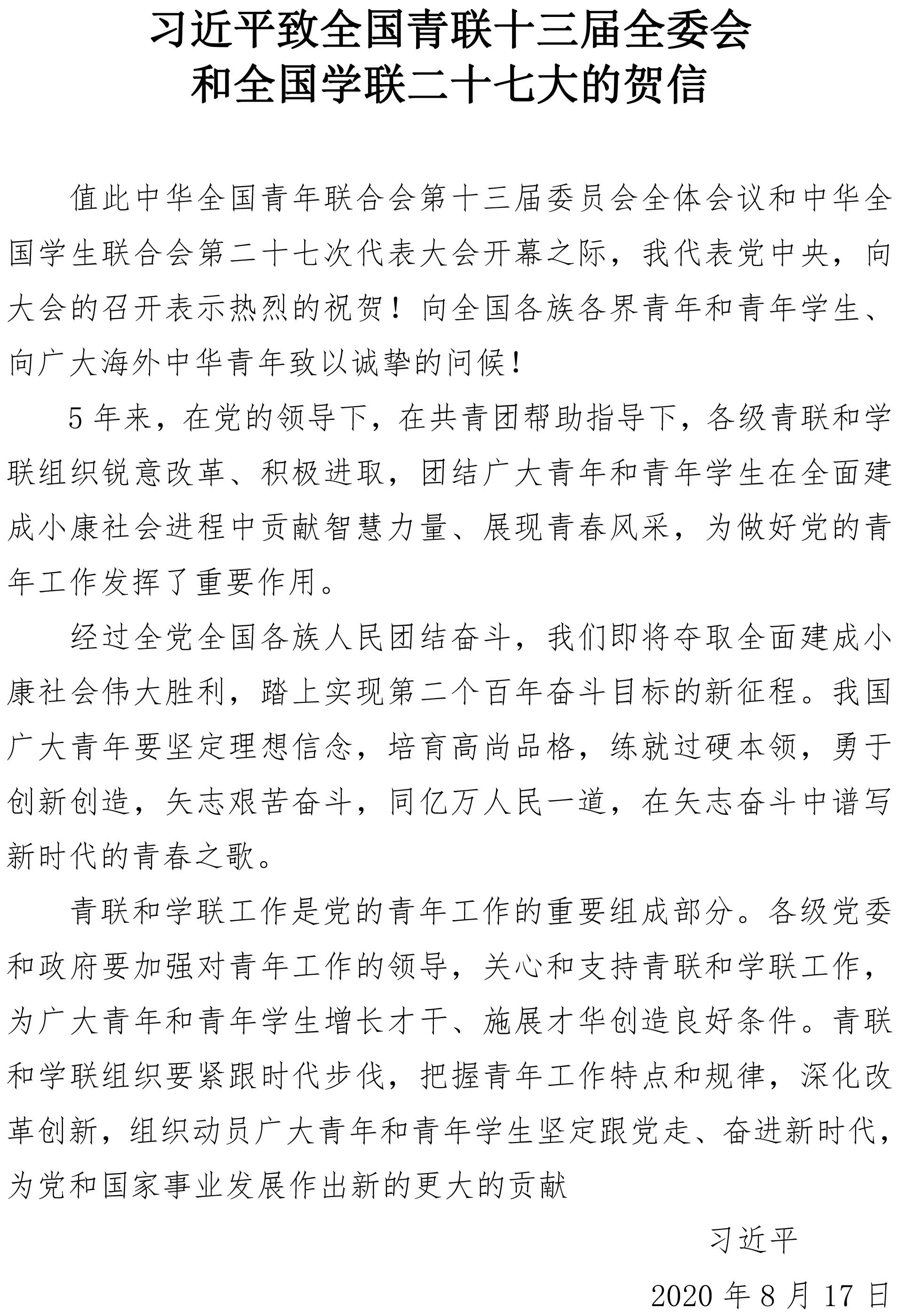 习近平致全国青联十三届全委会和全国学联二十七大的贺信
