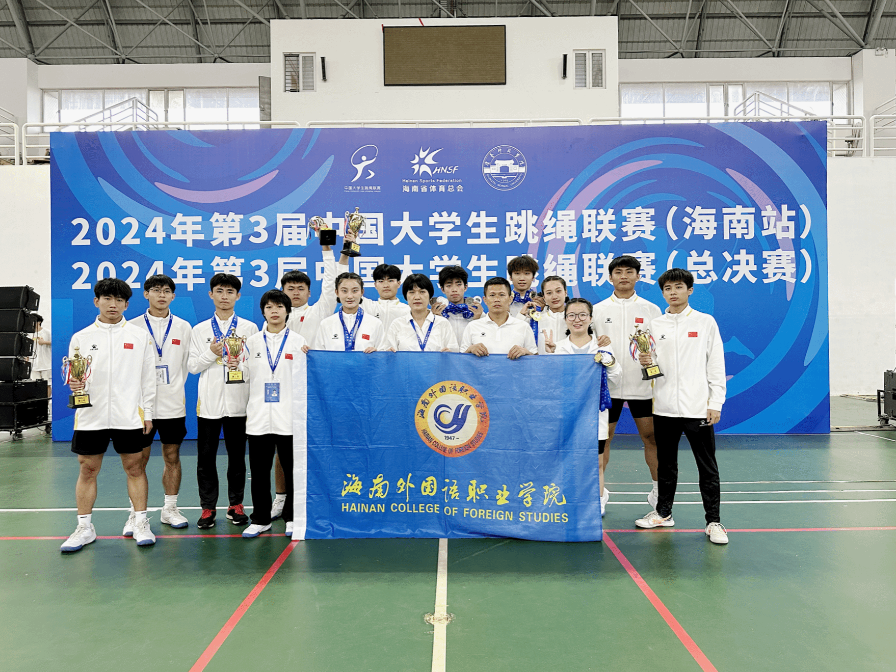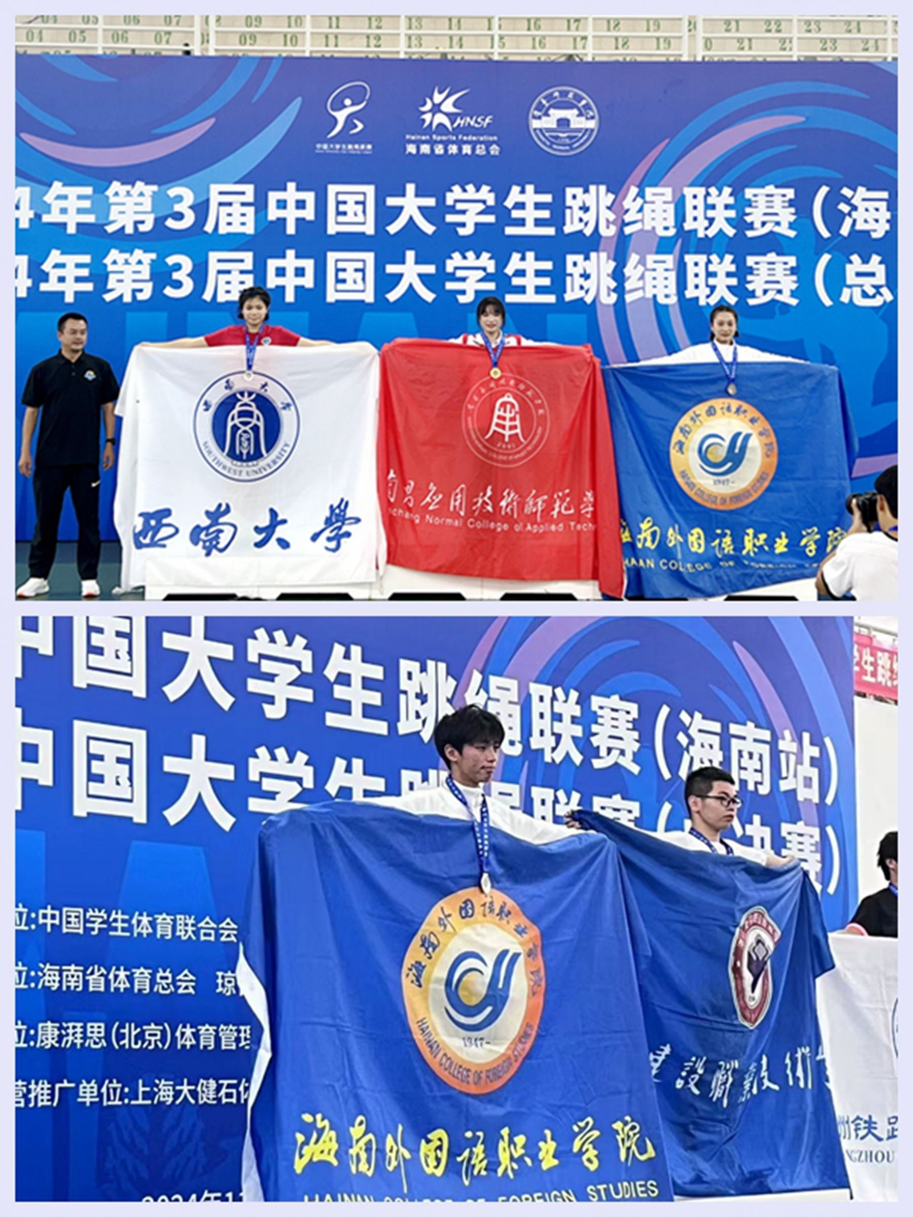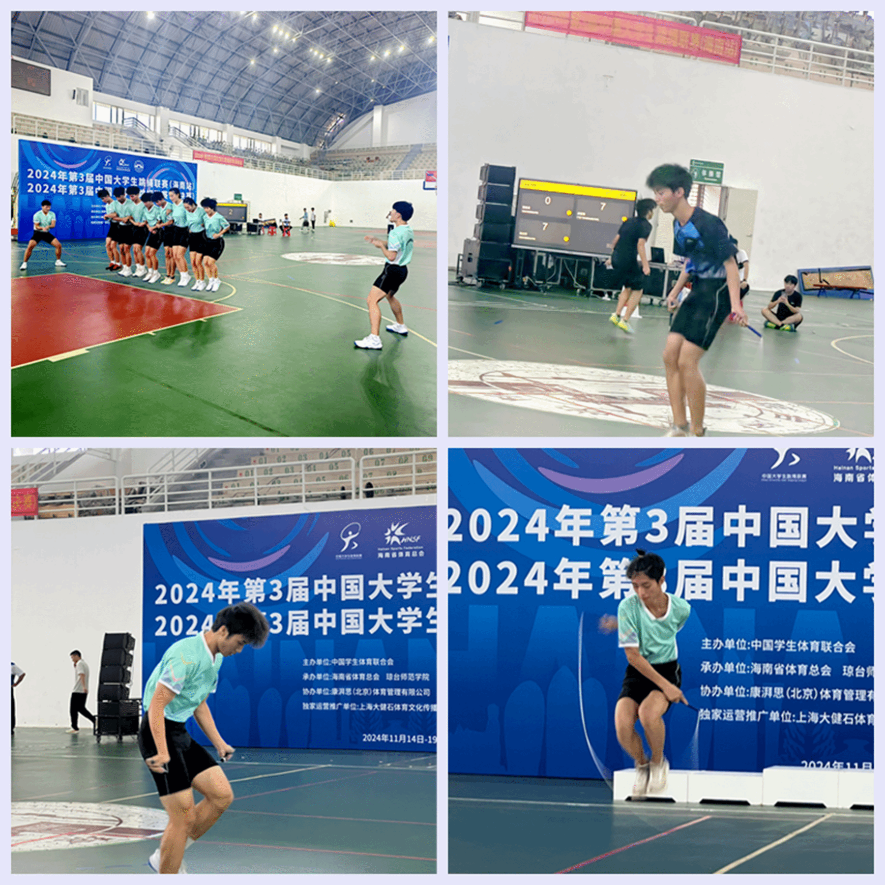 11月14日至18日,由中国学生体育联合会主办的2024年第3届中国大学生跳绳联赛在海口举办,来自全国多所知名高校,包括西南大学、上海财经大学、广州体育学院等,齐聚一堂,共同角逐荣誉。比赛分甲组(普通组)、乙组(高职高专组)及丙组(高水平组)三个组别,各组别设有计数赛、花样赛、规定赛三个大项20个小项。beat365跳绳队分别参加乙组和丙组的比赛,经过四天激烈的角逐,最终取得6金7银3铜的优异成绩,其中在首次参加的丙组跳绳比赛中获得1金2银2铜的好成绩,实现了新突破。同时,徐晓娟和李广两位老师被评为比赛优秀教练员。