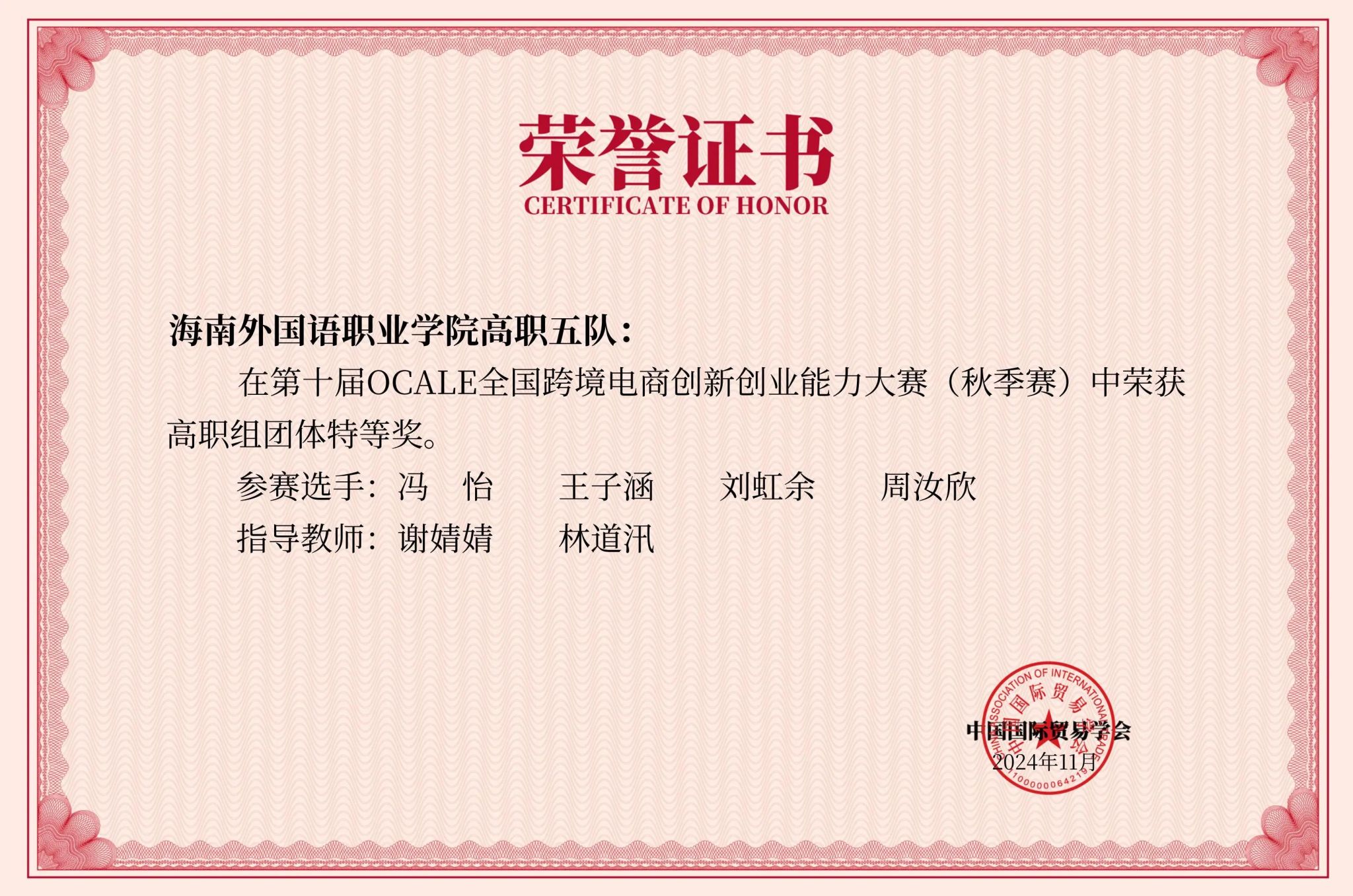 近日,由中国国际贸易学会举办的第十届OCALE全国跨境电商创新创业能力大赛(秋季赛)顺利结束。经过激烈角逐,beat365国际商务学院冯怡、刘虹余、周汝欣、王子涵同学团队,潘金菊、王晓凤、王琼南、刘靖雯同学团队以及陈嘉腾、游家好、汤凯翔、梁川同学团队3支队伍在大赛中表现优异,分别斩获全国特等奖;王娇娇、符馨梅、林诗然、张嘉敏同学团队获得全国三等奖。谢婧婧、林梅、林道汛老师分别获优秀指导老师特等奖。