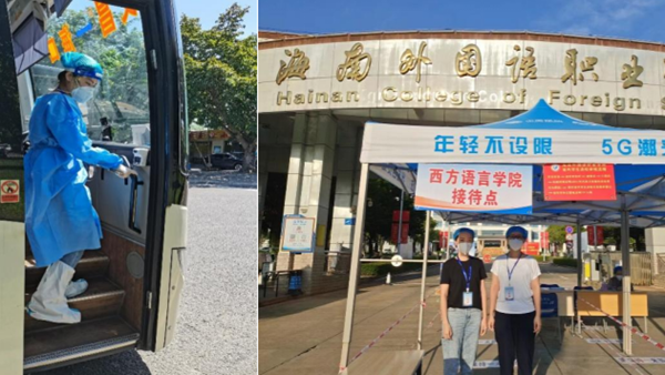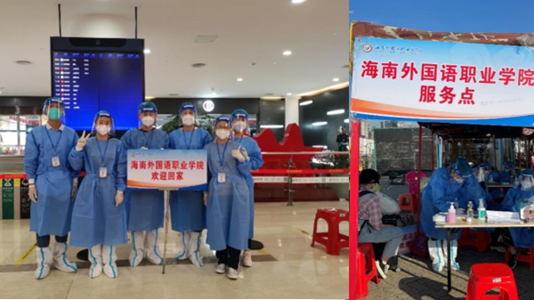 在机场、火车站派驻点,西方语言学院的志愿者老师们,穿着防护服“全副武装”, 24小时坚守。老师们举牌迎接省外返校学生,引领学生做好行程信息核查、登记,走专用通道进行体温检测、核酸采集,并安排专车接送至学校。