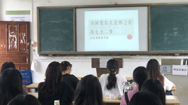 为活跃学生学习氛围,提高学生的学习积极性并考察学生学习情况,5月9日20应西班在1404举行了语言技能训练之动词变位大比拼。比拼前,教师先对动词进行总结,从动词的功用、分类以及复杂的语法变化,包括人称、时态和语态等方面概述。随后进行动词变位大比拼,比拼分为两轮,第一轮为抢答,教师展示变位动词,学生抢答动词原形;第二轮为计时答题,要求学生在规定的时间内完成50道动词变位题,结束答题后教师进行讲解。