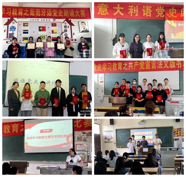 此外,西语系各语种专业还举行丰富多彩的校园活动,西班牙语党史知识竞赛、共产党宣言法文版书写比赛、党史学习教育德文书写比赛、意大利语党史朗诵比赛、葡萄牙语党史朗诵大赛、“用俄语讲党史”演讲比赛等校园活动,不断引导青年学子学史明理、学史增信、学史崇德、学史力行,从百年党史中汲取奋进新征程的磅礴力量。