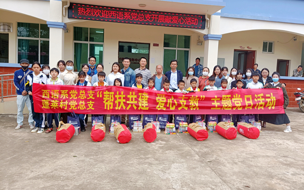 为进一步深化党史学习教育,推进“我为群众办实事”实践活动,我系党总支部与文昌市蓬莱镇蓬莱村党总支部达成结对共建单位,共同发挥党建引领作用,促进党建优势互补,构建基层党组织结对共建新格局。12月14日,西语系党总支部一行20名师生党员前往蓬莱镇蓬莱村,与蓬莱村党总支部开展“帮扶共建 爱心支教”主题党日活动。