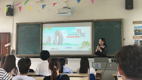 由赵晨希老师为学生们介绍海南自由贸易港建设的相关政策、发展目标、既得成就。赵老师首先向学生们提出三个问题,什么是自由贸易港?为什么选在海南?对普通民众有什么优势?引出海南自贸港自建设以来的一系列动作,经济发展态势等,鼓励大家努力学习,成为小语种人才,为自贸港建设服务,贡献力量。