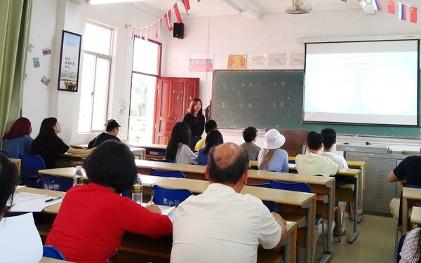 西语系党总支书记黄子艿、副主任刘茂媛教授,学院督导委副主任危卫红教授、林勤副教授、林师茂老师、陈显才老师,以及西语系全体教师参加了本次活动。