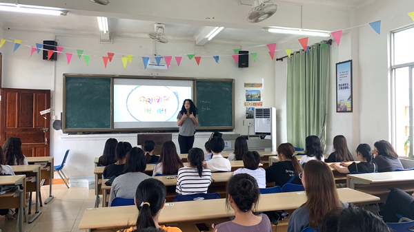 最后,神秘嘉宾-西班牙语外教露西亚的出现点燃了全体新生的热情。外教为同学们带来了具有西班牙特色的小礼物,并进行西班牙语一句话教学,活动现场气氛浓烈。