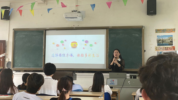 西班牙语教研室主任何月老师从语种概况、课堂教学、实践活动、合作办学和升学就业五个方面介绍了西班牙语专业的情况,勉励大家珍惜光阴、努力学习,为将来的就业和继续深造打好基础。