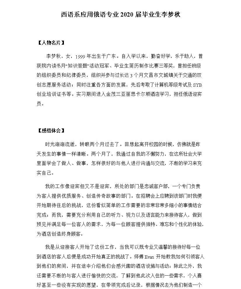 【优秀实习生事迹】西语系应用俄语专业2020届毕业生李梦秋