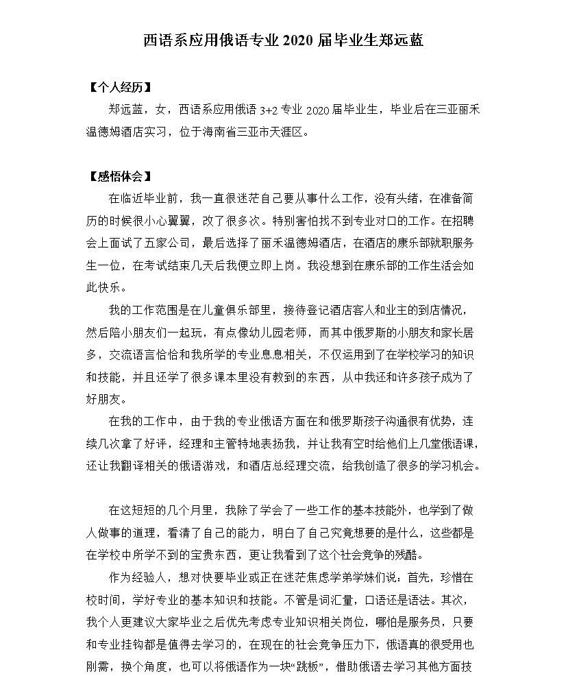 【优秀实习生事迹】西语系应用俄语专业2020届毕业生郑远蓝