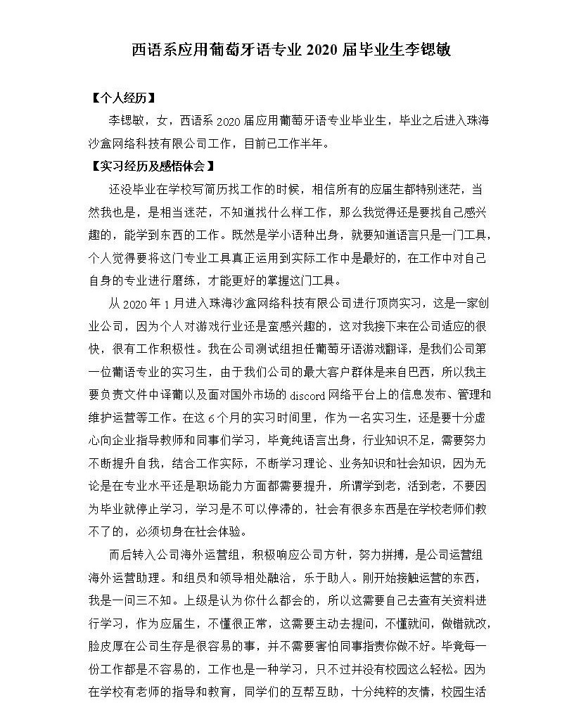 【优秀实习生事迹】西语系应用葡萄牙语专业2020届毕业生李锶敏
