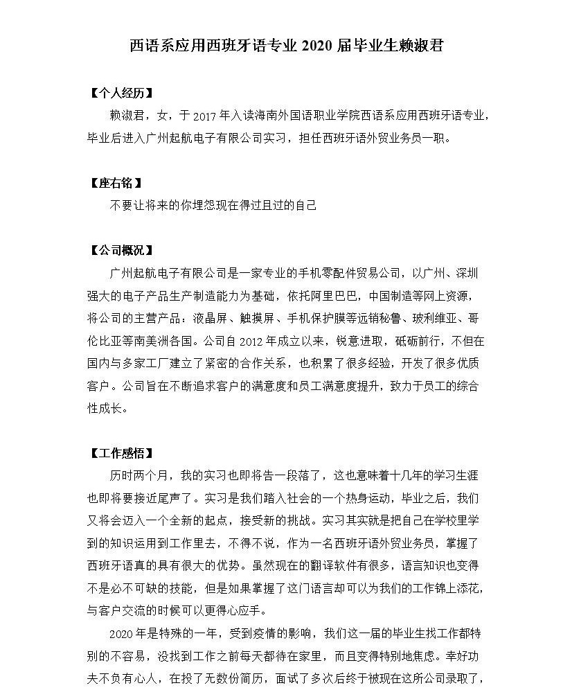 【优秀实习生事迹】西语系应用西班牙语专业2020届毕业生赖淑君