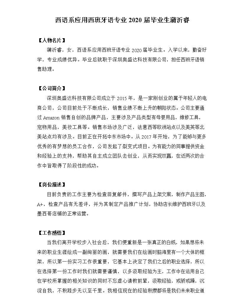 【优秀实习生事迹】西语系应用西班牙语专业2020届毕业生蒲沂睿