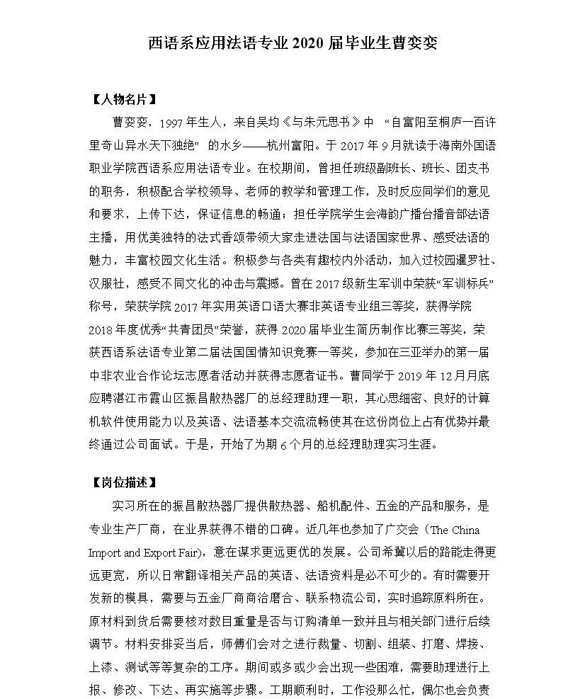 【优秀毕业生事迹】西语系应用法语专业2020届毕业生曹娈娈