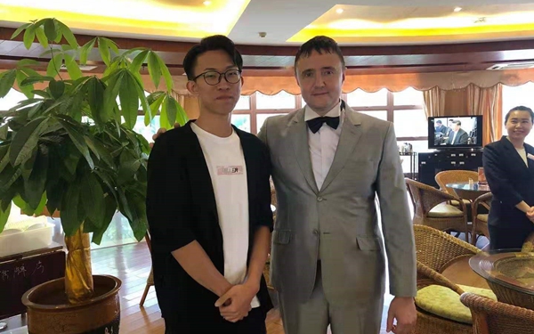 图为18应俄专业傅增喜同学在翻译工作后同俄罗斯钢琴家康斯坦丁合影