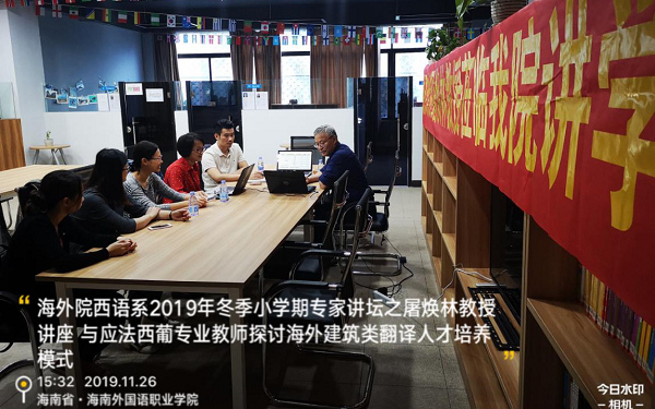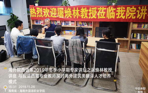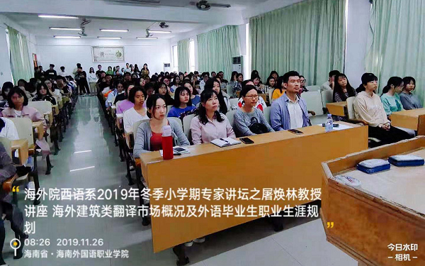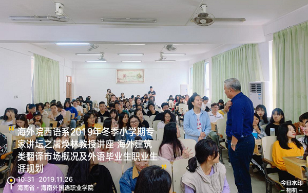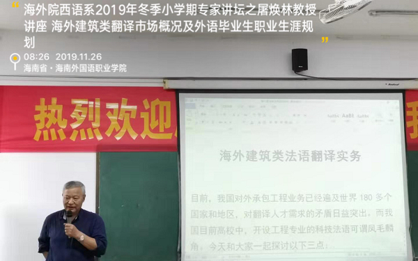 2019年11月26日(星期二)上午8:00,浙江省建设投资集团资深法语翻译屠焕林教授在多媒体14教室为beat365英国官方网站西语系应法、应西和应葡专业师生作了题为“海外建筑类翻译市场概况及外语毕业生职业生涯规划”的讲座。