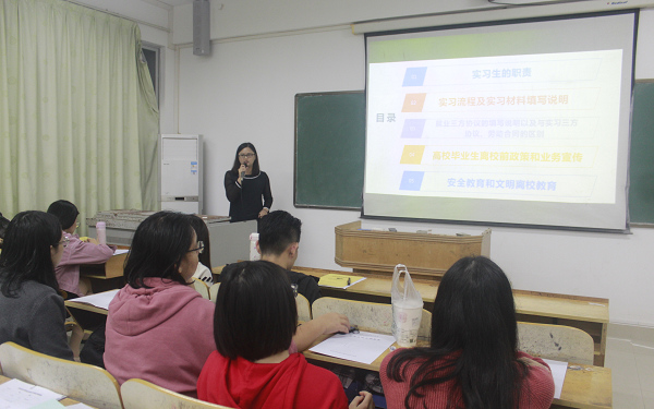 最后由系实习就业指导员潘虹禅老师分别就顶岗实习目的、注意事项、目标任务、过程管理以及顶岗实习办理流程等方面对顶岗实习学生提出全面要求和安排。其中重点谈及毕业条件和就业情况,敦促毕业生自我检查在校的学习任务完成情况;从学生管理角度,针对顶岗实习平台、实习材料和就业协议书填写情况、安全求职、毕业离校手续办理等具体细节进行指导,宣传国家对大学生就业创业方面的支持政策,例如基层就业,毕业生参加国家、省三支一扶(包括省贫困市县乡镇工作)、大学生村官等项目内容。