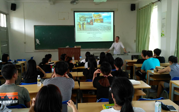 德语外教克里斯以“德国科技与生活”为主题展开讲座。他用浅显易懂的方式向学生介绍德国科技的发展,以及科技是如何更好地融入当地百姓生活。他列举的丰富实例和数据体现出德国人的一贯严谨,让在场的学生不禁连连称赞。