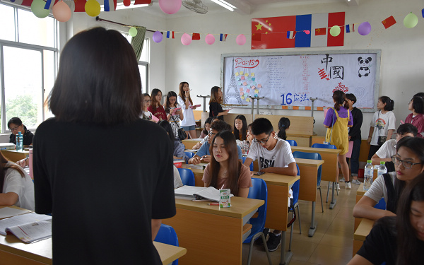 首先走进16应法班,迎面看到的是大大小小的中法国旗,法国国旗颜色的气球以及法国特色建筑图片,让人感受到一种浓浓的法兰西风情。