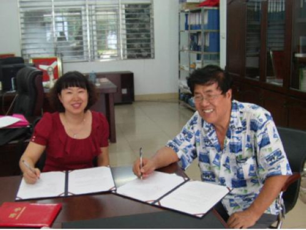 上图为西语系陈国亭教授与黑龙江大学俄语学院副院长黄东晶教授签署合作协议