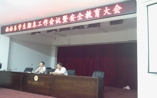 2012年6月17日晚7点30分,西语系在图书馆多功能报告厅召开2011—2012学年度第二学期期末学生工作会议暨学生安全教育大会。西语系负责人陈国亭教授、党支部张政书记、团总支顾大育书记、学生科莫少金科长及全体辅导员、班主任以及全系在校学生参加了会议。