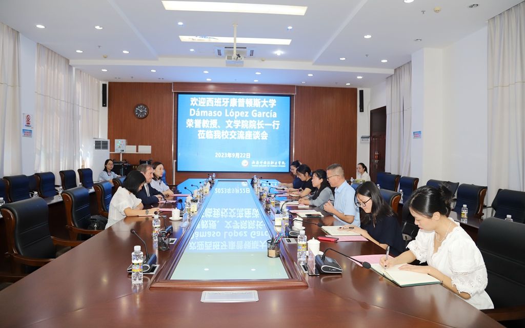 国际合作与交流处相关人员、西方语言学院西班牙语专业教师等参加座谈会。