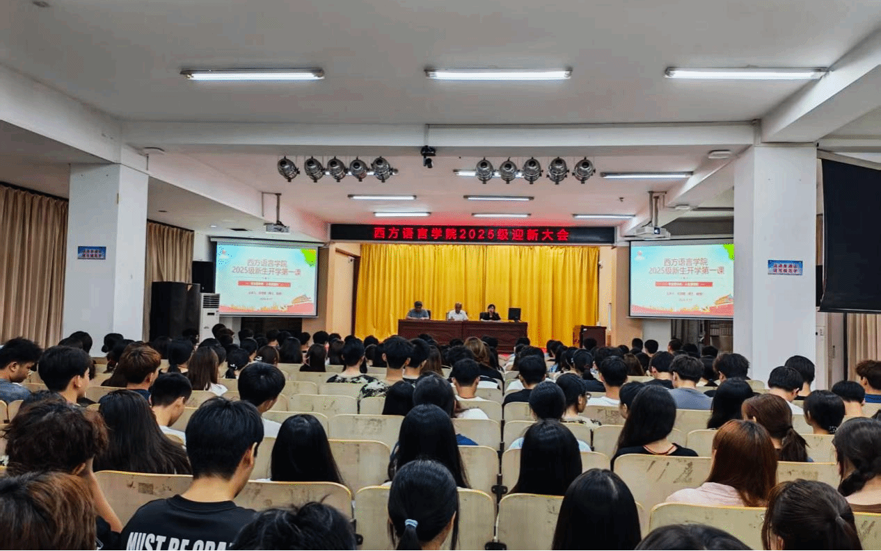 金秋送爽,丹桂飘香。9 月 17 日,西方语言学院 2025 级迎新大会在多功能报告厅隆重举行。学院党总支书记黄子艿、院长刘茂媛、党总支副书记符振忠、办公室主任桂雯雯、教学秘书林丽萍,以及新生班主任、辅导员与全体 2025 级新生齐聚一堂,共同迎接新生们开启大学新篇章。
