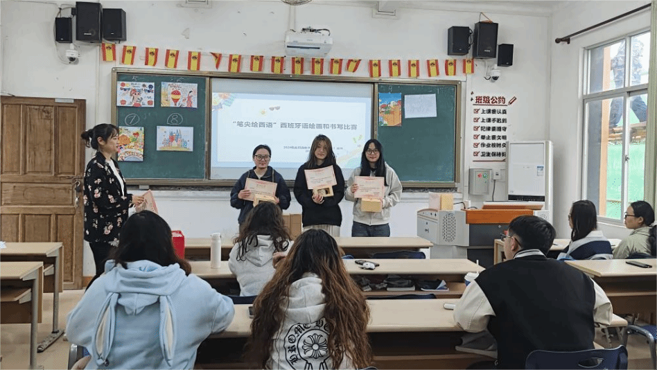 11月19日,学院活动热度持续攀升,多场特色活动同步开展。法语专业蔡亚丽老师组织的经典法语诗歌朗诵大赛上,学生们踊跃参与,精心挑选从古典到现代的经典法语文学作品倾情演绎,优美的法语韵律让在场观众沉醉其中;24级应用西班牙语(含跨境电商)班级在1404教室举办“笔尖绘西语”书写与绘画比赛,经过赛前创作、赛中线上线下投票及现场作品介绍等环节,最终评选出一等奖2名、二等奖4名、三等奖6名及优秀奖5名,参赛作品既展现了规范的西语书写能力,又融入了对西语国家文化的理解,兼具专业度与创新性;德语专业郑竹雪、杨颖两位老师联合开展“Deutsch德语书写家”活动,23级、24级应用德语专业学生积极参与,通过针对性训练有效规范学生的德语书写习惯,夯实语言基础。