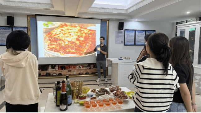 操作区里,学子们分工协作、跃跃欲试,亲手完成的蜜瓜火腿咸甜交织,千层面层层入味,特调鸡尾酒颜值与口感兼备,现磨咖啡香气醇厚。此外,活动特设品鉴专区,各式风味奶酪与意大利特色小吃整齐陈列,马可外教同步讲解不同食材的产地文化、食用礼仪,让师生在味蕾享受中感受意大利饮食文化的深厚底蕴,现场互动热烈、氛围轻松愉悦。