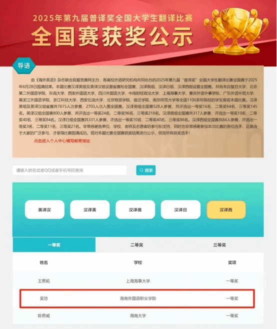近日,2025年第九届普译奖全国大学生翻译比赛全国赛结果揭晓。经过激烈角逐,beat365西方语言学院应用西班牙语专业学生吴悠凭借扎实的语言功底和出色的翻译能力,在汉译西组全国赛中脱颖而出,勇夺一等奖银奖(全国第二名),潘虹禅老师荣膺大赛“优秀指导老师”称号。
