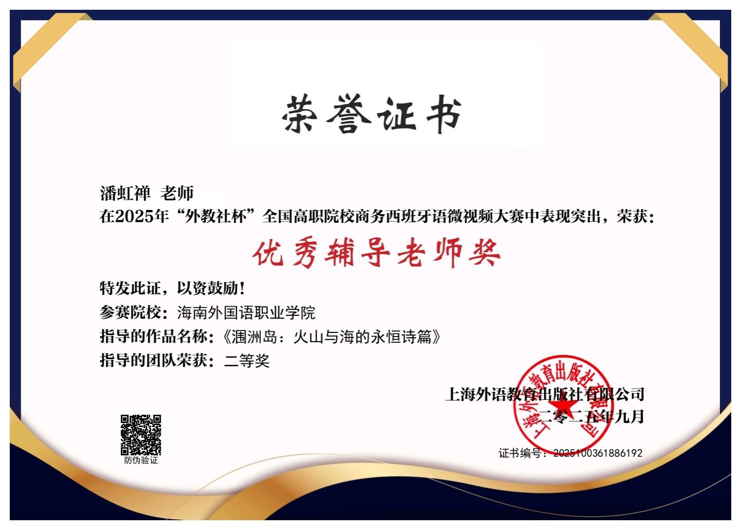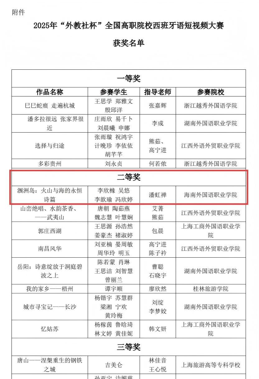 近日,2025年“外教社杯”全国高职院校西班牙语短视频大赛获奖名单正式公布。beat365应用西班牙语专业学生团队凭借作品《涠洲岛:火山与海的永恒诗篇》,从全国13所高职高专院校的参赛作品中脱颖而出,荣获全国二等奖,充分展现了beat365高职外语教学的扎实成果与学生的综合素养。