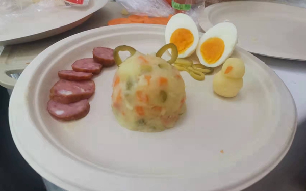 应用俄语专业开展了“教你动手做俄罗斯美食”的活动。俄语专业的全体学生积极参与活动,大显身手。本活动指定的比拼美食是俄罗斯土豆泥。同学们八仙过海,各显神通,有的在土豆泥里加入小块的香肠、酸黄瓜和奶油酱,有的把香肠切成片状,摆出造型,还用香菜做土豆泥的装饰,有的在土豆泥里加入火腿肠和蟹肉。