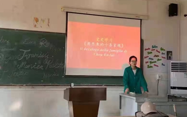 意大利语专业的同学们在意大利语教师许金然带领下学习了意大利语版的《周恩来的十条家规》(Il decalogo della famiglia di Chou En-lai),学生们通过学习了解到周恩来总理的十条家规,并结合了所学专业知识,接受了党史学习教育。