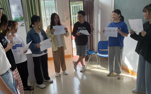 22日上午,葡萄牙语专业大一和大二在校学生在郑祺老师的带领下,进行了一场富有意义的单词游戏——“萝卜蹲”。
