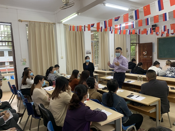杨毅副院长做指导讲话,首先肯定了本次活动开展的积极意义,课程思政是近年高校教育教学的热点之一,西语系能结合热点开展教研活动值得肯定。其次充分肯定了几位老师的课堂展示环节,认为老师们基本功扎实、备课充分、课件精美、教学过程听说读写面面俱到。最后勉励老师们开展小语种课程思政时不仅要讲好中国故事,还要讲好海南自贸港的故事和海南文昌航天城的故事。
