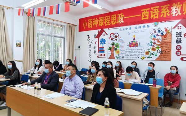 11月23日周二下午3点到6点在1号教学楼1205教室,西语系在此举行2021年冬季小学期系列活动之教师风采展,本次教研活动主题为“小语种课程思政”。出席活动的有学院副院长、督导委主任杨毅教授,督导委副主任林勤教授,西语系主任刘茂媛教授以及全体西语系教师。