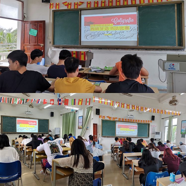 西班牙语专业两个班级共计70名学生参加书法比赛,伴随着清扬的音乐,学生们在纸上书写他们对西班牙语的热情。