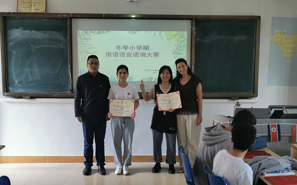 俄语沈老师与获得一等奖的同学合影