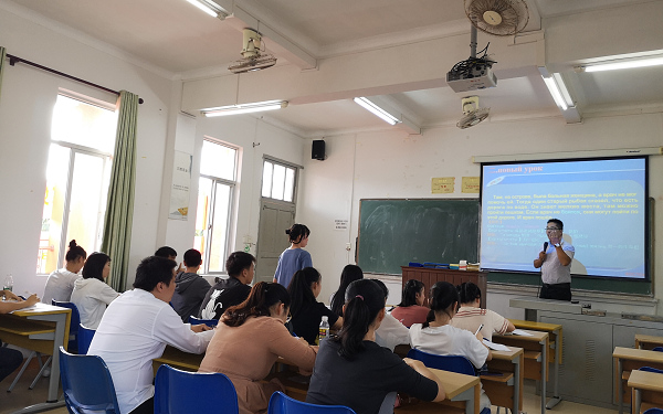西语系曲教授给老师们讲解了此类课程的讲授方法,希望老师们在课堂上能要求学生用外文进行复述或转述,单词应在课文中讲解,而不是单独罗列,另外在外语课堂上应用外文授课,中文辅助授课。
