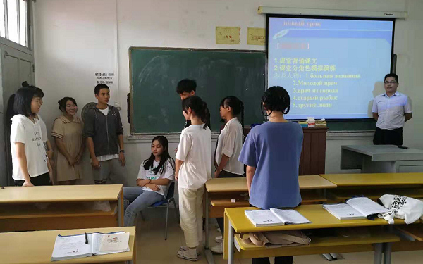 在紧张的词汇学习后,开始进入情境模拟演练环节,每组的练习时间大约3-5分钟,学生们认真准备,表演到位,俄语表达流利,最后沈老师对每组的演练及时点评,通过现场演练,逐步提高学生实际的俄语表达能力。