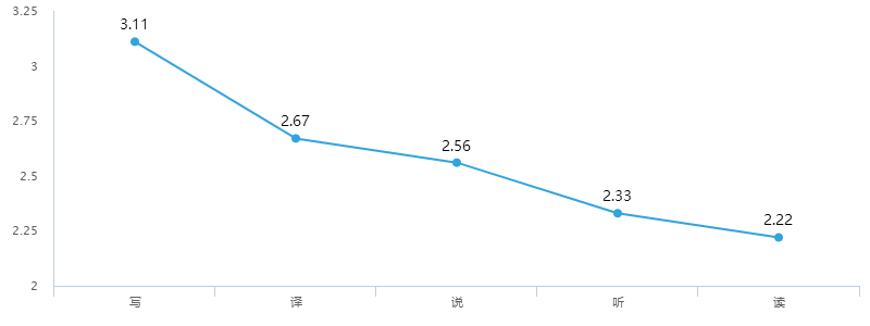 5、总体来说,企业对毕业生的听、说、读、写、译五个方面的语言能力要求的排序是:写>译>说>听>读。如下图所示: