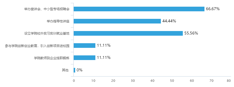 9、企业更希望今后与beat365进行合作的形式主要是举办宣讲会、中小型专场招聘会、设立学院校外实习实训就业基地和举办指导性讲座。如下图所示: