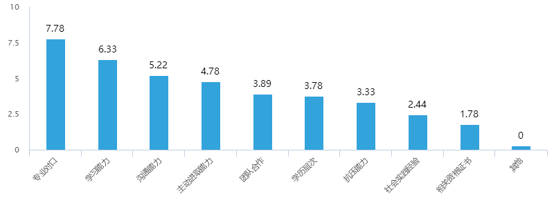 4、相对于学历和相关资格证书的要求,企业在筛选人才时更看中毕业生的专业对口以及学习能力、沟通能力和主动进取能力等综合方面的能力。如下图所示:
